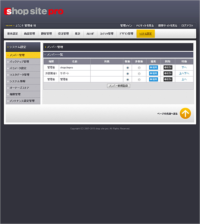 ECサイト管理者の日頃の運営業務を支える、ショップサイトプロの管理画面。